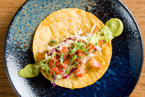 Mahi mahi, corn tortilla, avocado salsa, cabbage mix, pico de gallo, chives